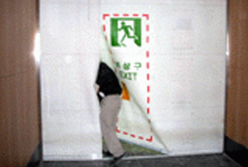 특수섬유로 구성된 방화 스크린으로 백화점과 같은 대규모의 건물 및 대형 소매점 등에 화재 발생시 비상구 내장형 방화셔터로서 화재에 의한 연소를 최소화하고 화재가 확산되는 것을 방지할 뿐만 아니라 인명의 피해를 최소화하기 위하여 설치하는
